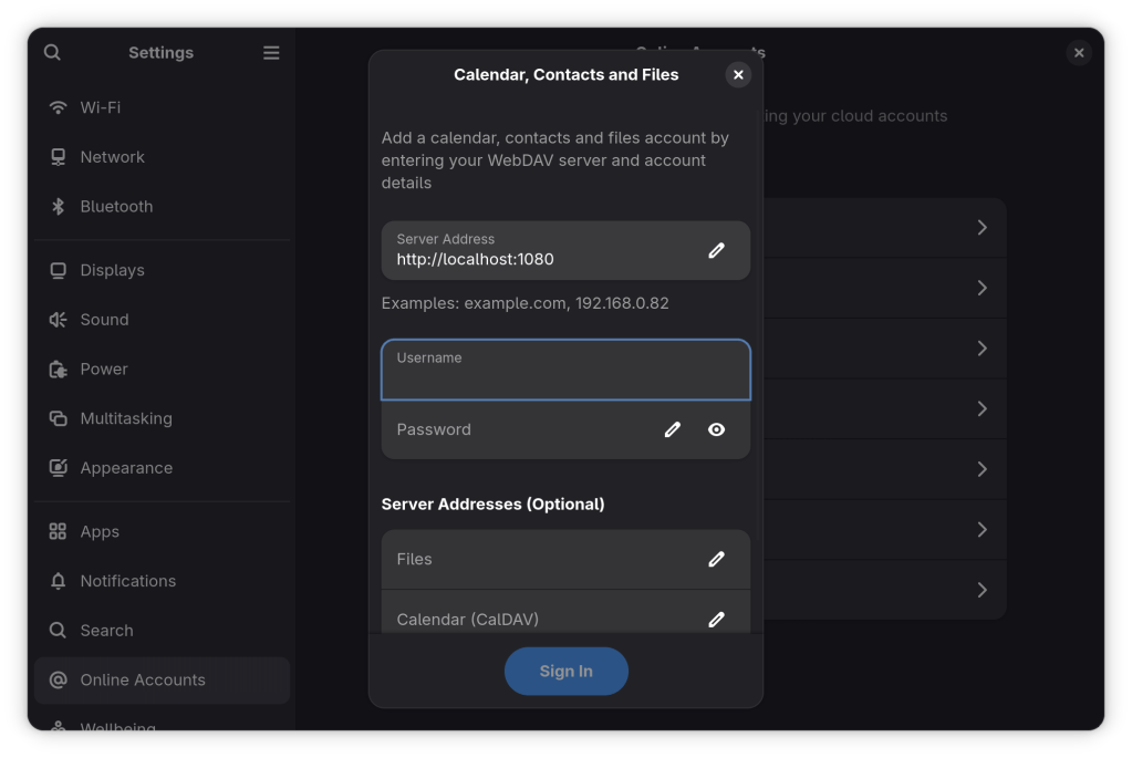 For calendar, head into online accounts (again, I’m using Gnome) and add a webdav calendar, popinting at localhost:1080: