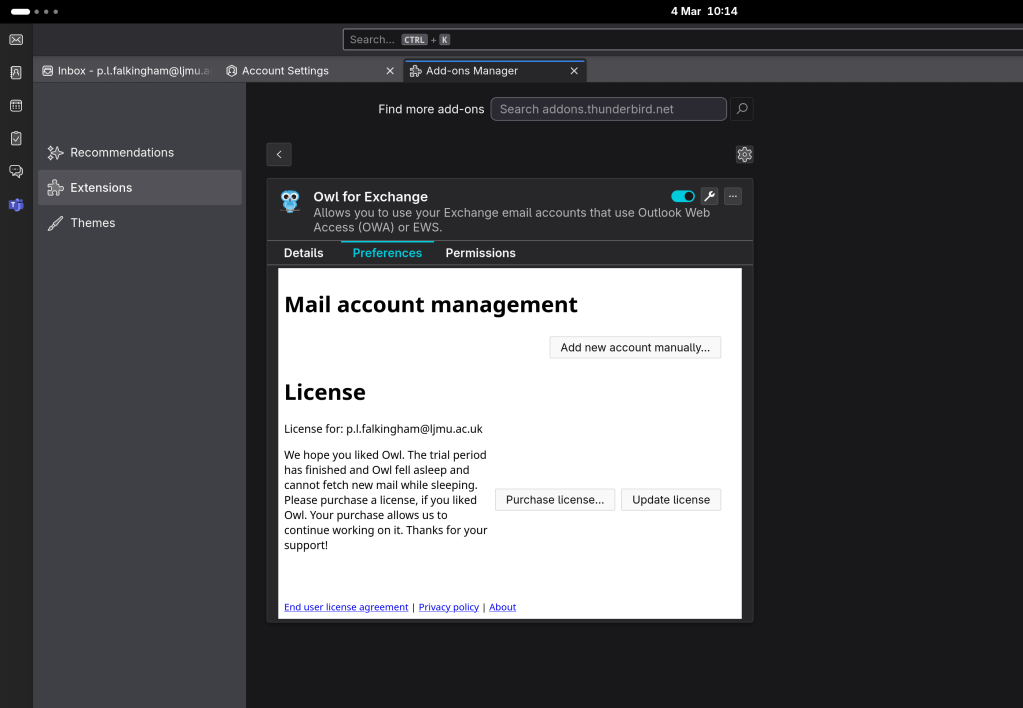 You could also just use Thunderbird with OWL for Exchange This is a perfectly affordable addon for Thunderbird that will embed both email and teams into Thunderbird directly. Since Thunderbird updated it’s UI, it doesn’t autodetect Owl during account setup, so you need to go to addons, and then add account manually from the owl addon: