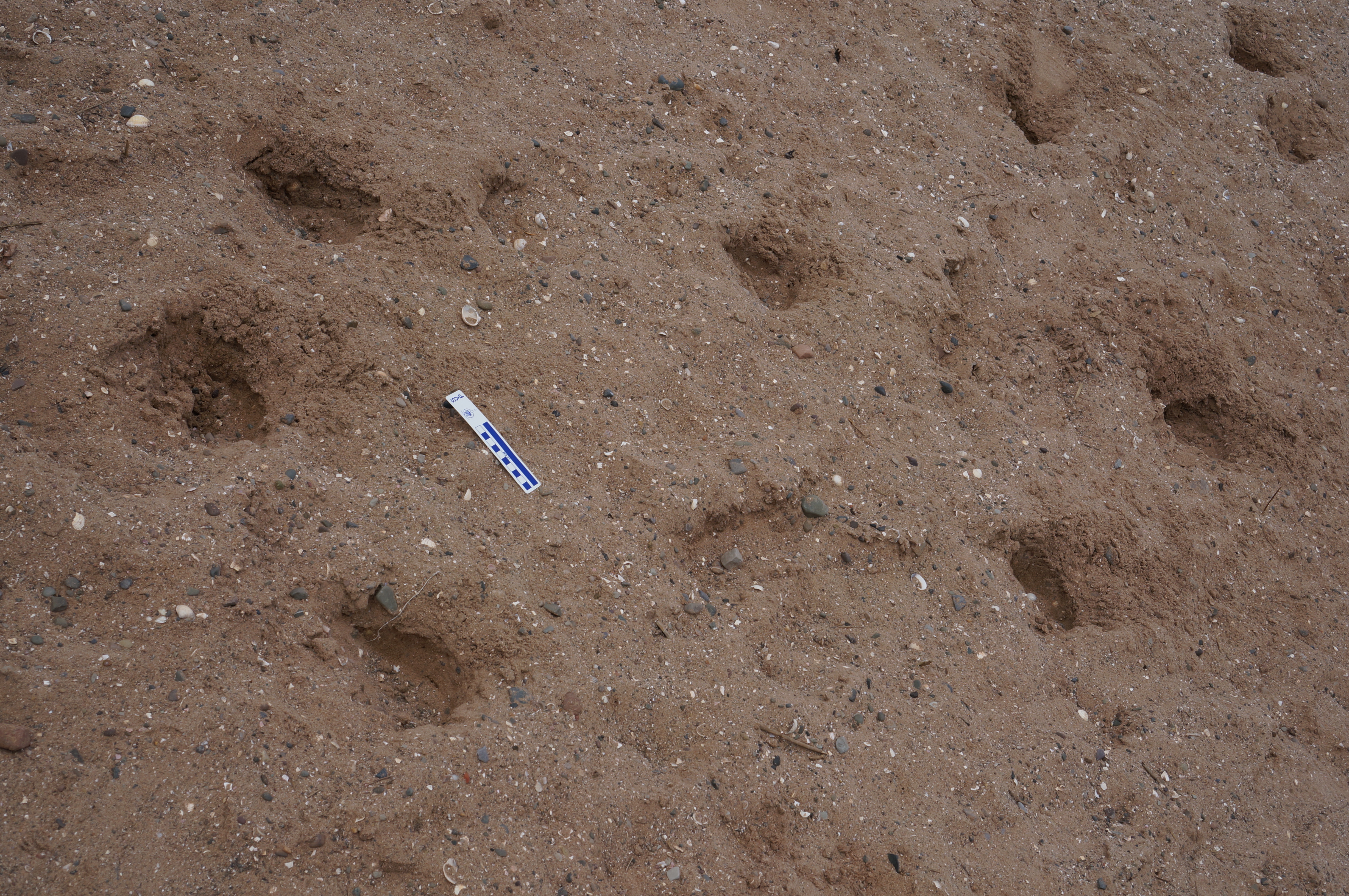 I recorded it for two reasons: The first is that the tracks show a very distinct anterior-posterior asymmetry to the depth profile, which we often see in fossil dinosaur tracks. The second is that this is a fine example of something we see often in the fossil record – a series of holes with no obvious structure. There’s certainly at least two sets, heading in opposite directions, and the proximity to the shore means they are oriented similarly (albeit opposite).