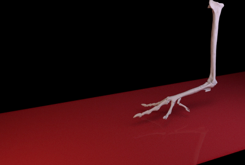 Here’s the input data, a Guineafowl walking on a solid surface (captured with XROMM, rendered in Maya):