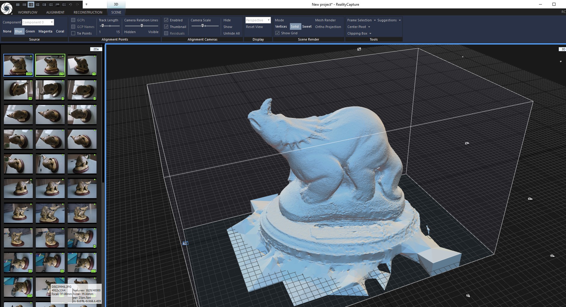 So, the reconstruction looks great, very complete. All 53 cameras were matched, and there’s not a lot of noise around the horn (which is usually problematic), and the (shiny) brass plaque was good too: