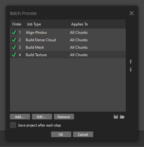 Then I got to Workflow->Batch Process, and in turn I add each stage, applying to all unprocessed chunks: