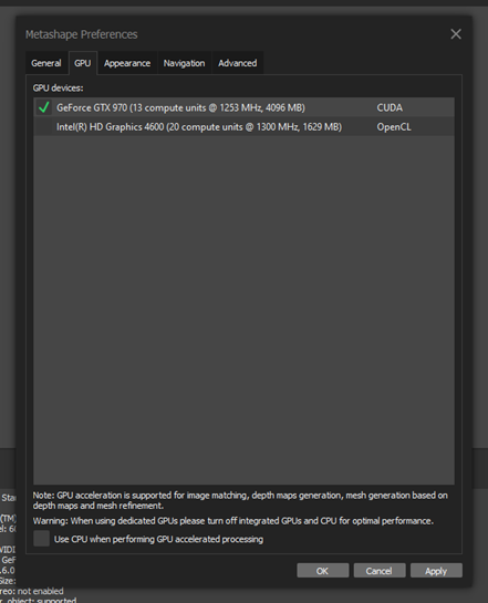 First thing I do is make sure Metashape is using my GPU(s), by going to Tools->Preferences->GPU: