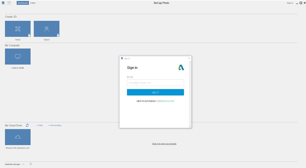 When you’ve downloaded and started Autodesk ReCap Photo, you are met with this UI: