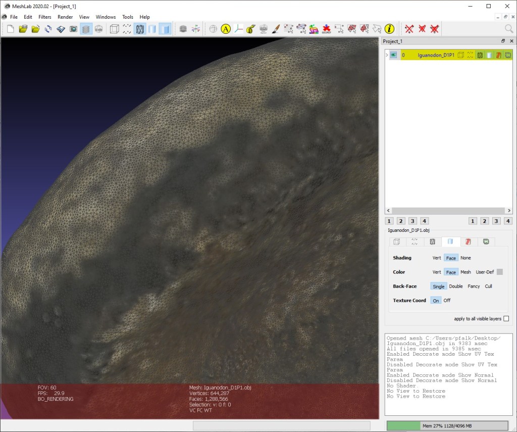 Working with photogrammetry, laser scanning, and all the other techniques I dabble with/intimately rely on, I generate a lot of 3D data. For the most part that data is usually very high resolution, and often quite noisy and in need of cleaning up. I want to detail here some of the software I’ve come across that can be used to clean up, reduce, and generally process 3D data – particularly meshes but also point clouds. As usual, my focus is on freely available software.