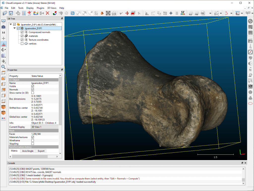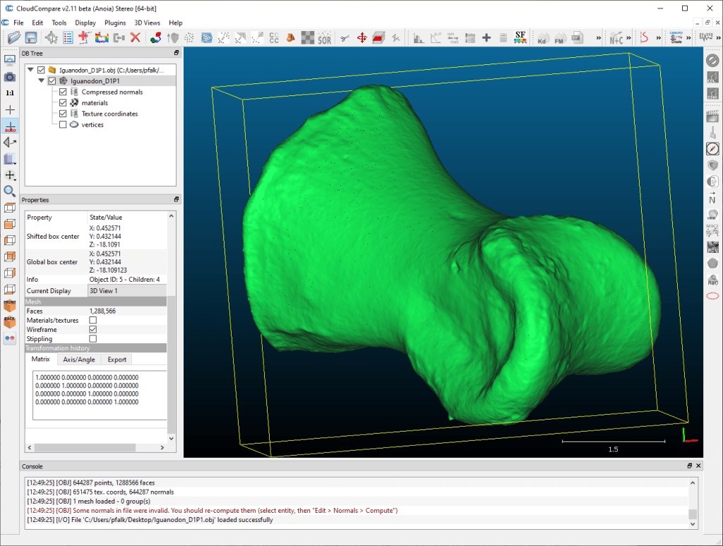CloudCompare really took over from meshlab a few years ago for me – it has a toolset more in line with the tasks I tend to do, and is just a bit easier to use. As the name suggests, it was developed originally to work with point clouds, and one of the nuances of using cloud compare is that some functions need to be applied to the vertices of a mesh, not the mesh itself.