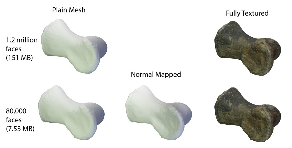 Clearly, decimating the mesh and normal mapping it isn’t losing appreciable detail, but vastly reduces file size, making it easier to work with. Of course, as outlined in two recent papers here and here, you should always keep the raw data (in the case of photogrammetry, the photos), so that high resolution models can be used or at least remade in the future as necessary. But, it may make sense for your own purposes to downsample and re-texture just to make working with the models easier.