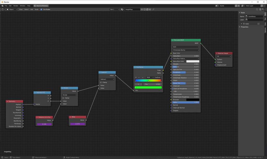 In Maya, I had a buggy Arnold shader network for applying height ramps.  I thought I’d have a crack at learning the node-based shader system in Blender.  Turns out, it’s super straight forward, and despite having never used it before, in less than an hour I had a height map shader that can flexibly be adjusted in scale and position!