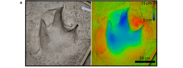 Part of figure 2 from Falkingham et al 2018, showing textured and height-mapped track. This was done in Arnold and Maya.