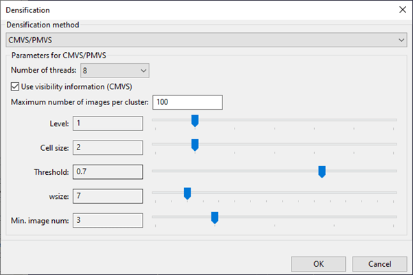 And again, I’ll stick with default settings for now, but will come back to this later, because densification method includes CMVS/PMVS as the default, but also MVE, which I’ve had great success with previously, and SMVS which I’ve had even better luck with.