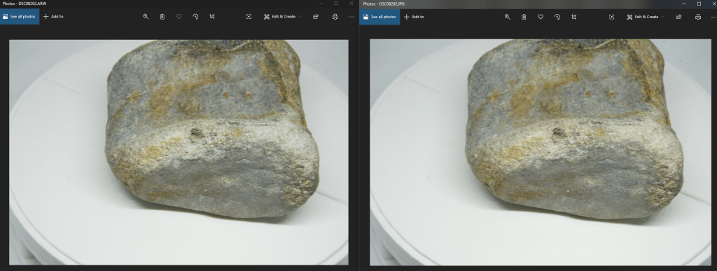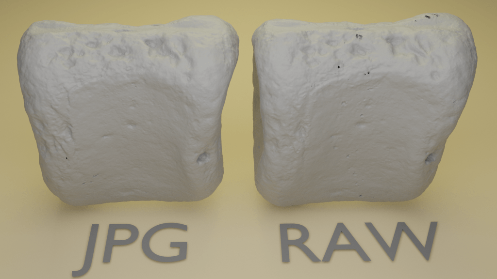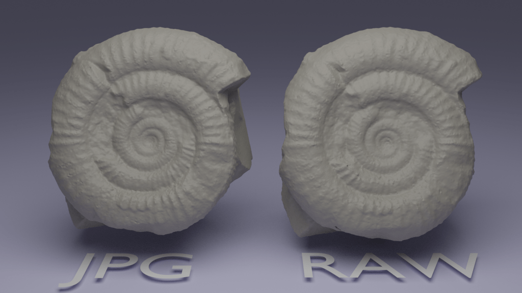 Before I summarise, I want to cover my back and address a couple of glaring issues. First, this test is just on close-range photogrammetry. I don’t imagine it would be that different, but Drone or large-scale photogrammetry might behave differently. Secondly, The set-up was reasonably good, and I took half decent photos to start with; both specimens were in a light box, and had good contrast against the background. Dark objects against dark backgrounds (or light against light), or poor lighting set-ups with low contrast might benefit from shooting RAW more. Thirdly, this test might only be applicable to Sony cameras – different vendors treat JPG conversion differently, and may lose or retain more detail. Finally, my textures are high res, but not extreme. If you’re producing 8k or 16k textures, you might find the differences more pronounced.