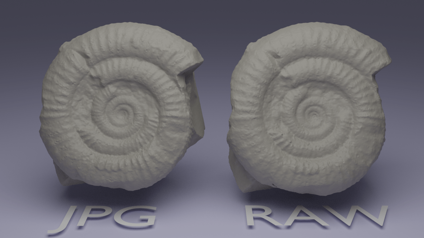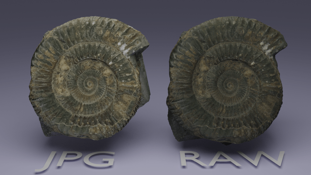 File space. That’s about it, but it’s a big one. The JPG datasets for the Ammonite and Vertebra were 918 MB and 0.99GB respectively. The RAW datasets were 4.9GB and 4.98GB, so about 5x bigger. I have hundreds of gigs of photogrammetry datasets going back a decade, and if they were all RAW files, I just wouldn’t have the space to store them. I know that storage space is constantly increasing, but so is the speed of photogrammetry software, so I’m taking more photos. I’ve made the case twice in the literature (once in Davies et al 2017, and again in Falkingham et al 2018) that when publishing photogrammetric data, the model and the original photos need archiving. Many of my JPG datasets are already pushing the limits of Figshare, Zenodo, and other data repositories, and are already difficult to share with colleagues over home broadband connections.
