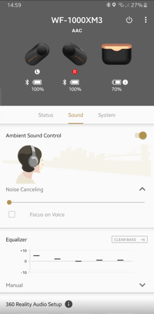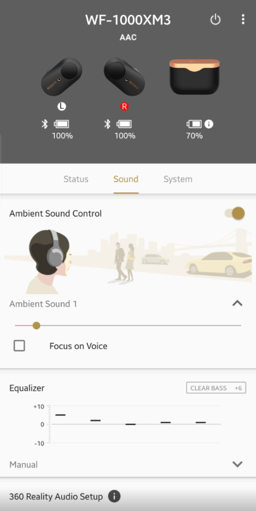There’s also an ambient sound mode, which through the app (see below) can be set to let any amount of ambient sound in. I actually think this is almost more impressive than the ANC – that I can have earbuds wedged in, press a button, and hear everything around me clearly.