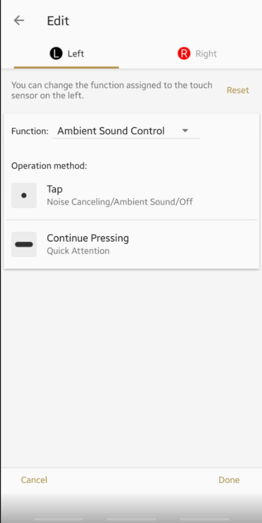 Setting the function to volume allows you to raise the volume with a tap, or lower it by continuing to press. That means there are gestures/commands not used by the other settings. I’d love to be able to invoke Alexa or Google assistant, but to do that from the earbuds, I have to remove the abaility to control playback or noise cancelling. Why? Why can’t I mix and match these commands? It seems like a significant oversight of usability to me.