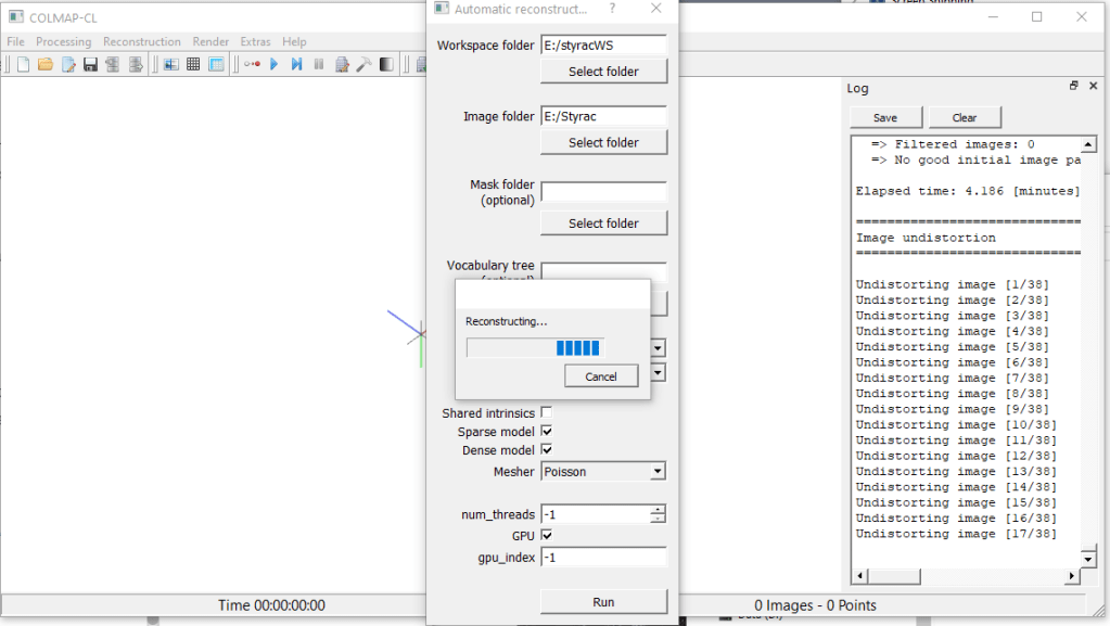 Now, I had initially issues running it on my main computer, because it kept trying to use both the Nvidia GPU and the integrated intel HD4600. Whenever it tried to use the intel, it would crash with very little info. I had to manually change the GPU index to 0 in the options so that COLMAP-CL only used the Nvidia card. That’s fixed as of time of writing, with version 0.9, though I was having issues with the Poisson meshing on my normal machine. The Delaunay meshing worked fine though.