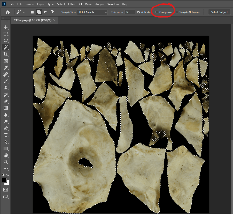 So, using the magic wand tool, I select all the black in the C1Tex image (make sure ‘contiguous’ is unticked), then I invert the selection with ctrl-shift-I, so that the image just has the areas of colour selected: