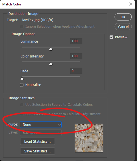It’ll preview automatically. Hopefully you can see straight away in the above image that the altered jaw texture looks wrong. That’s because by default, Photoshop is using the whole image to match colours, including all that black. We need to tell it to use just the selection: