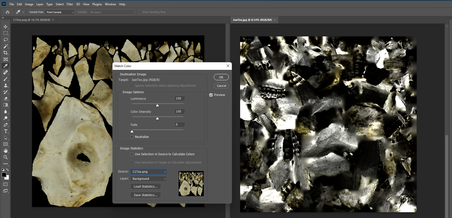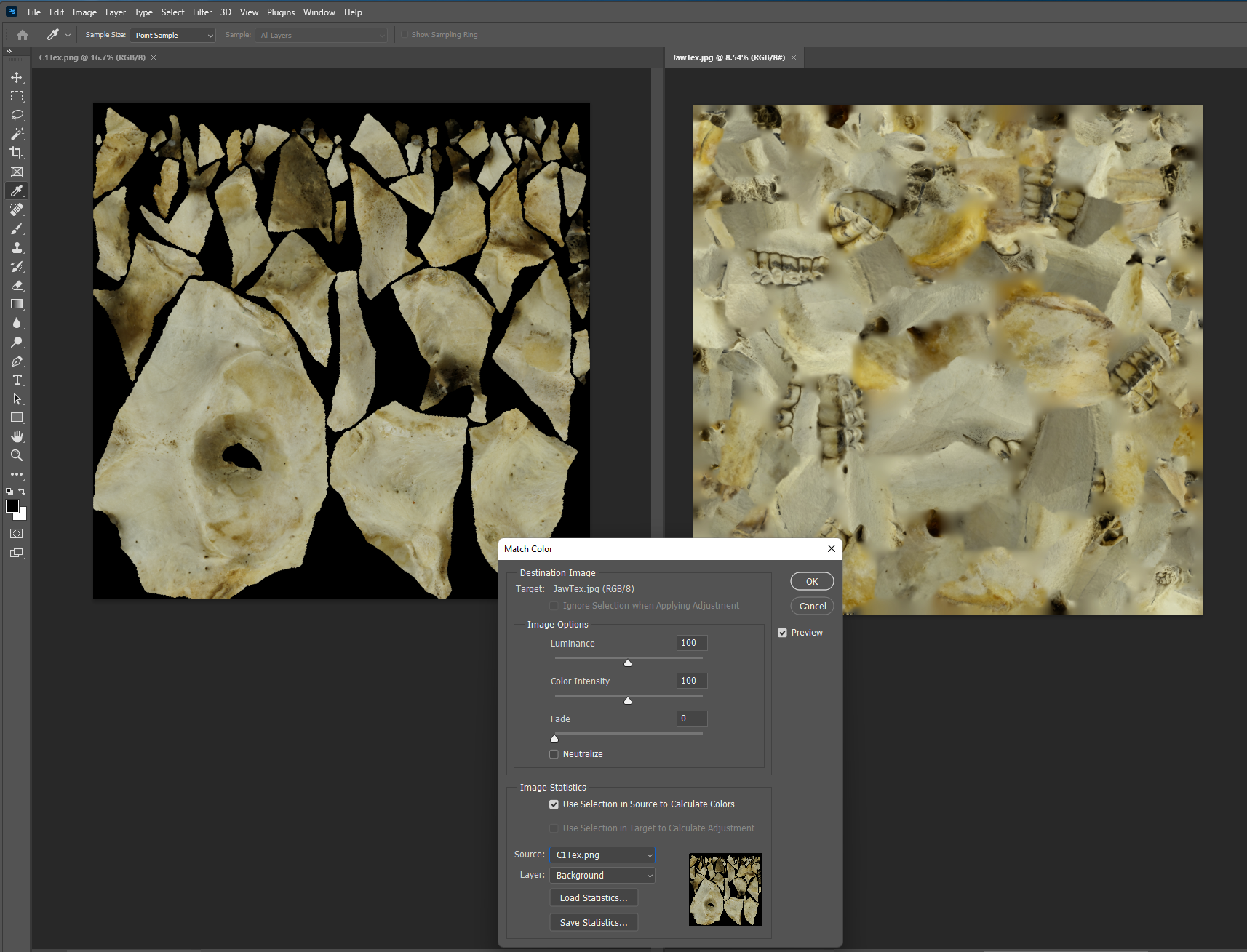 When it’s done, you can save the file out, probably best to do so with a new name (in this case ‘jawTex_matched.jpg’) so you don’t overwrite the old image.