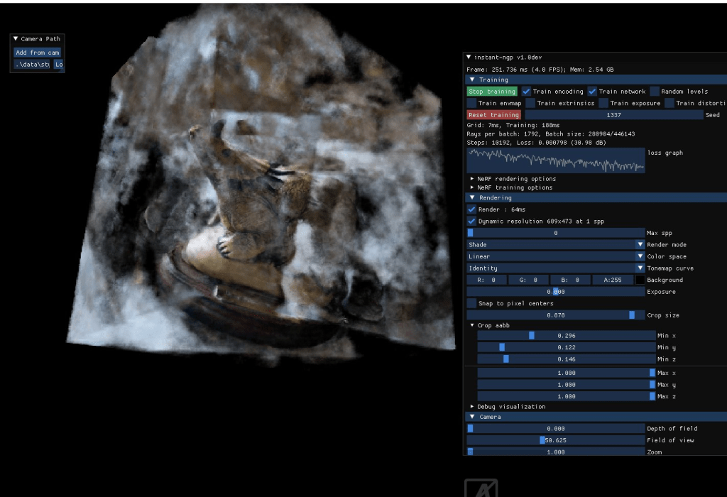 Instant-ngp is Nvidia’s software, available on github here: GitHub – NVlabs/instant-ngp: Instant neural graphics primitives: lightning fast NeRF and more. As you can imagine, an Nvidia CUDA-capable GPU is a necessity.