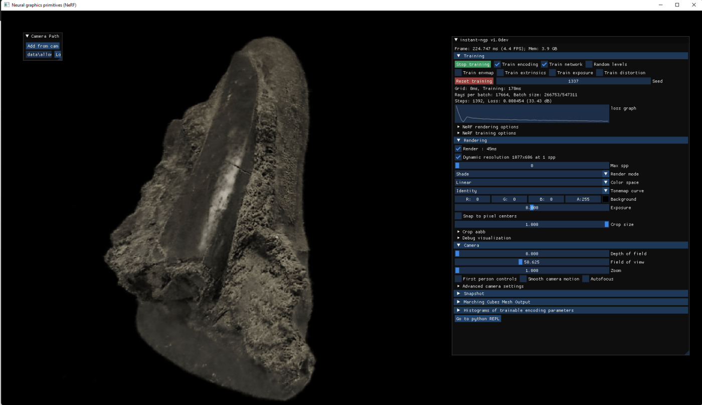 I’ve been testing out instant-ngp recently, it’s an open-source software from Nvidia that generates neural radiance fields.  That’s a 3D representation of an object that is fundamentally different from the points or verticies and faces we may be used to.  Rather than representing an object through 3D coordinates, connections between them, and colours (i.e. vertices and faces, plus textures), the digital representation is more about what light is doing at a given place in space. The result is something that looks incredibly realistic, and lacks the β€˜edge-ness’ of traditional meshes.