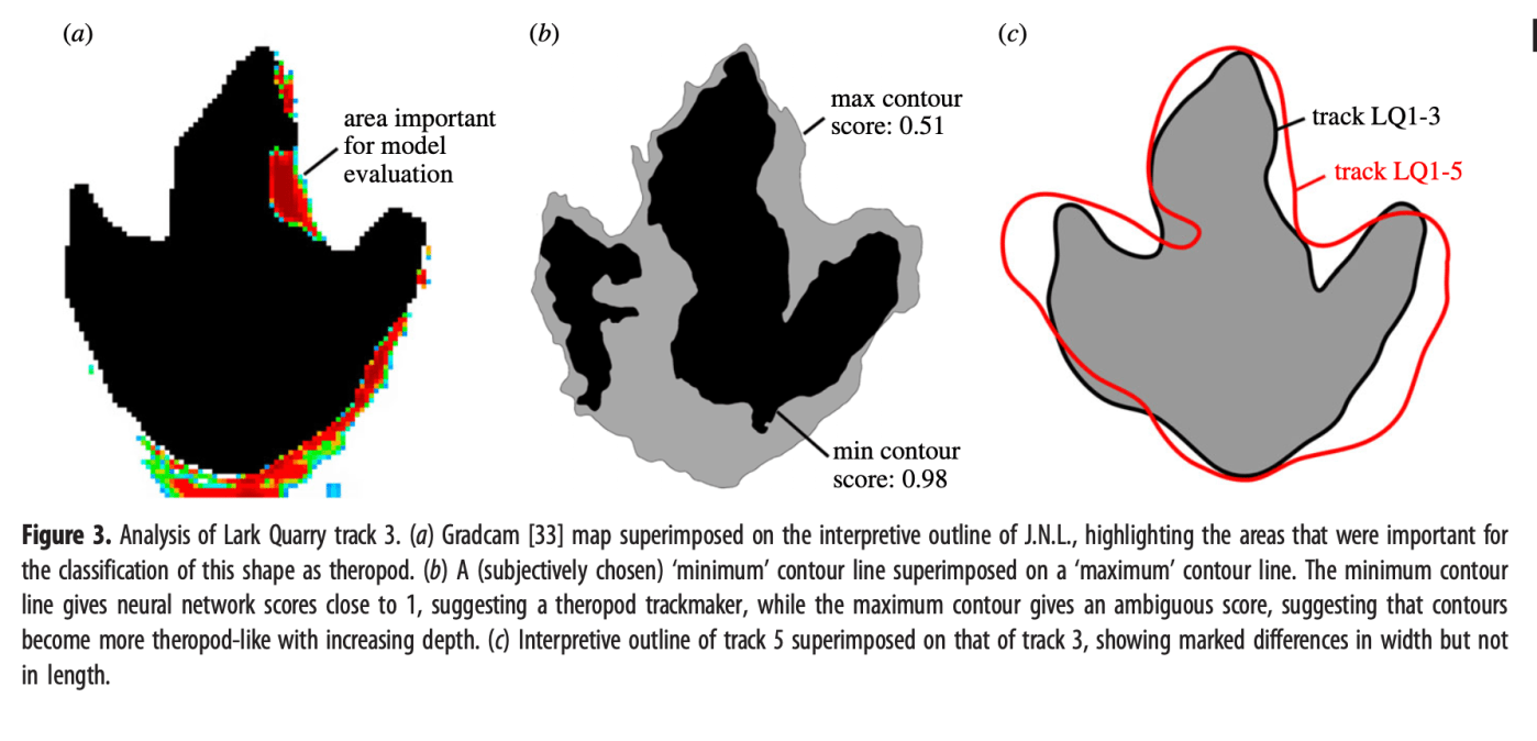 We took a closer look at that track 3, and saw the same thing with the neural network that I reported with morphometrics in 2016 – that the deeper you go, the more theropod-like the track becomes: