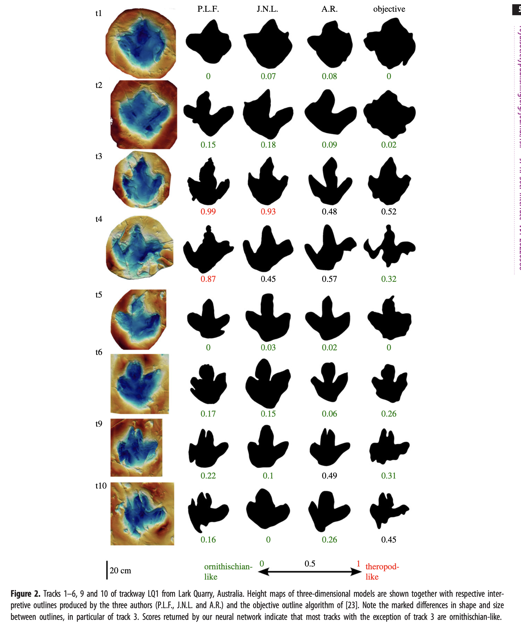 And we’re still left with interpretation being a major part of this. Looking at the 3D models above, I’d hope you’d agree that track 3 looks by far the least messy, and indeed this is the track that is generally considered the least distorted, and most closely matching the track maker’s foot. Jens and I both created outlines that were very theropod. Anthony’s outline was considered ambiguous or slightly ornithopod by the neural network, while the objective outline, based on curvature of the sides, came out slightly theropod.