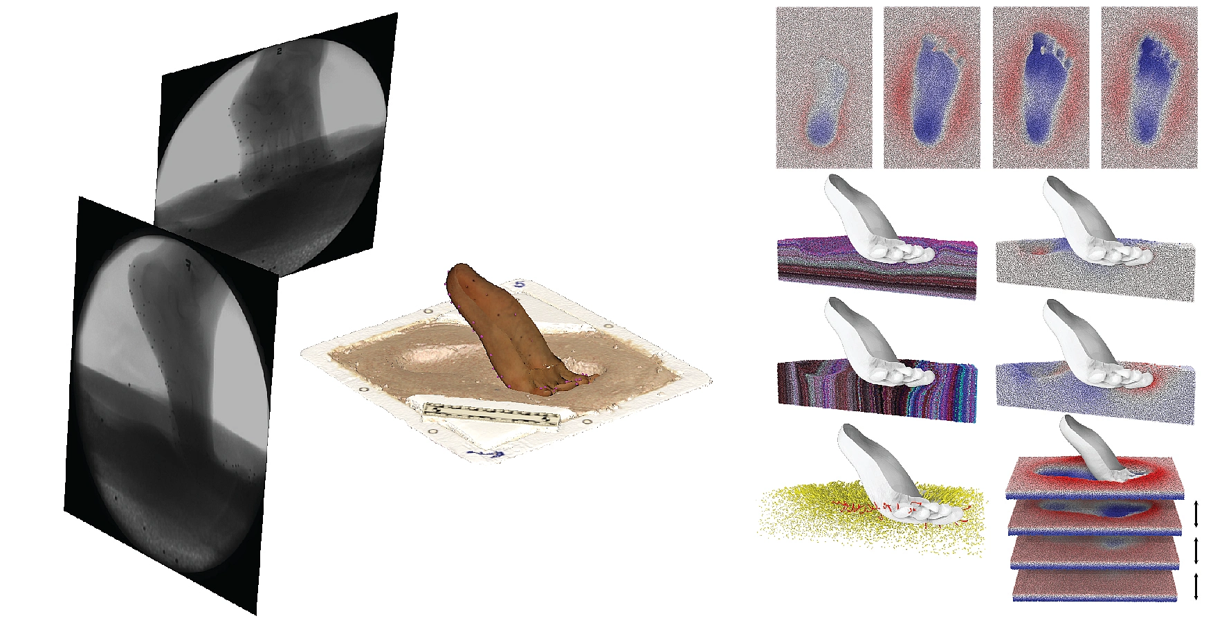 For this paper, we used a combination of techniques to study how footprints are formed and what they reveal about foot kinematics (these methods were published in Hatala et al 2021). We used biplanar X-ray, (XROMM), to record how four human subjects walked across different substrates, from solid to wet mud. We also used 3D animation and particle simulation to visualize how the foot deformed the substrate and created the footprint shape.