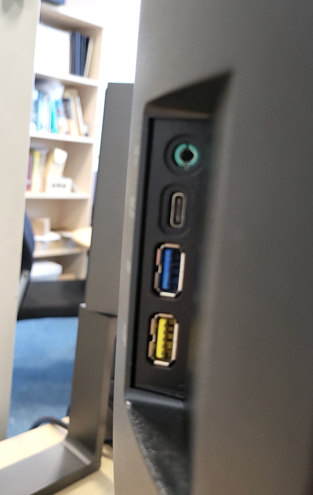 The monitor has several ports on the left hand side – 2 USB-A (one USB 3, one USB 4, a USB-C, and a 3.5mm audio jack. Kind of like the webcam, it’s great that they are hidden, and that makes for a nice distraction-free experience, but it’s also not particularly practical. USB-C can deliver 90W of power delivery, so good for charging devices.