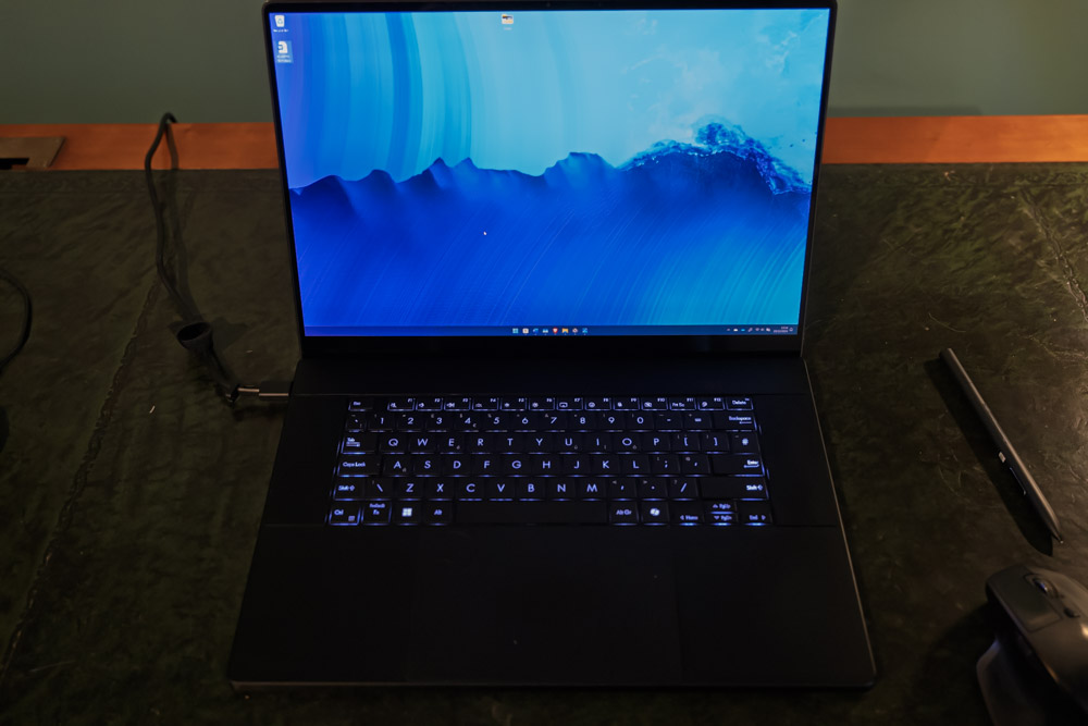 The ProArt P16 is stunning. It’s a matt black all over. If anything, it’s too black, because it just blends into my dark green desk in anything other than good lighting. Luckily the keys are backlit. Maybe that’s the pinnacle of an ideal laptop – I can’t see it when I’m working or playing at it in a moderately dark room. When it’s closed, there’s just this lovely subtle little branding on the lid. The whole thing is metal, except for the stupidly large trackpad that is made of glass. The trackpad isn’t haptic though, rather it’s the old-style ‘diving board’ that physically moves when you click it, and moves more near the bottom than at the top where it’s not clickable at all. I dearly miss the haptic touchpad of the Surface Laptop Studio, and it’s quite astonishing to me that a laptop premium in design (and price) as the ProArt P16 doesn’t have one. What the P16 does have is a small dial built into the touchpad. Activated with a swipe down on the right, you can then use it like you would the Microsoft Surface Dial or similar. The trouble is, it doesn’t work with the new version of lightroom, which is about the only place I think I’d use it. I dabbled with it when I first got the machine, but couldn’t really find a way to use it. It might be useful in Blender if I can be bothered setting it up.
