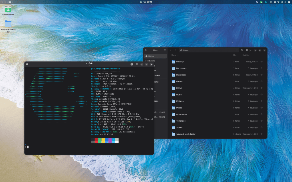 And so far, it’s a lot of work to not really accomplish anything I couldn’t already do in Windows. Very much more of a hobby than a distinctly productivity-enhancing endeavour. I also haven’t got CachyOS enrolled in secure boot yet either, so I’m going back and forth into the bios whenever I want to reboot into Windows.