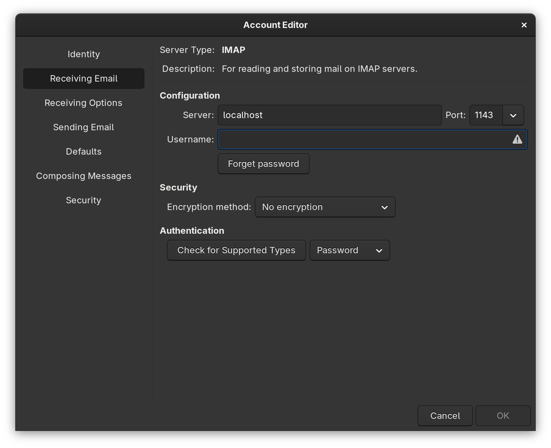 Set your receiving serer to localhost:1143, and your sending server to localhost:1025