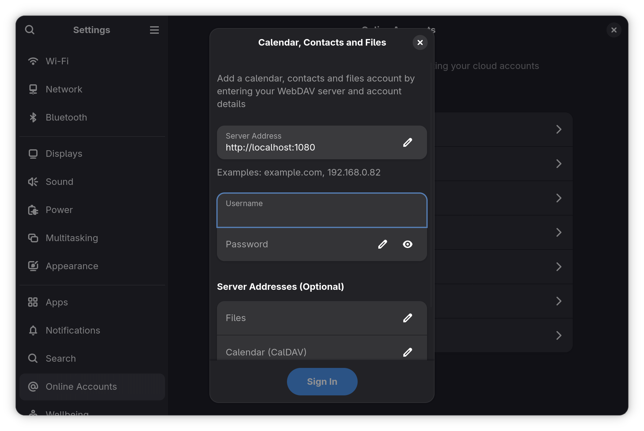 For calendar, head into online accounts (again, I’m using Gnome) and add a webdav calendar, popinting at localhost:1080: