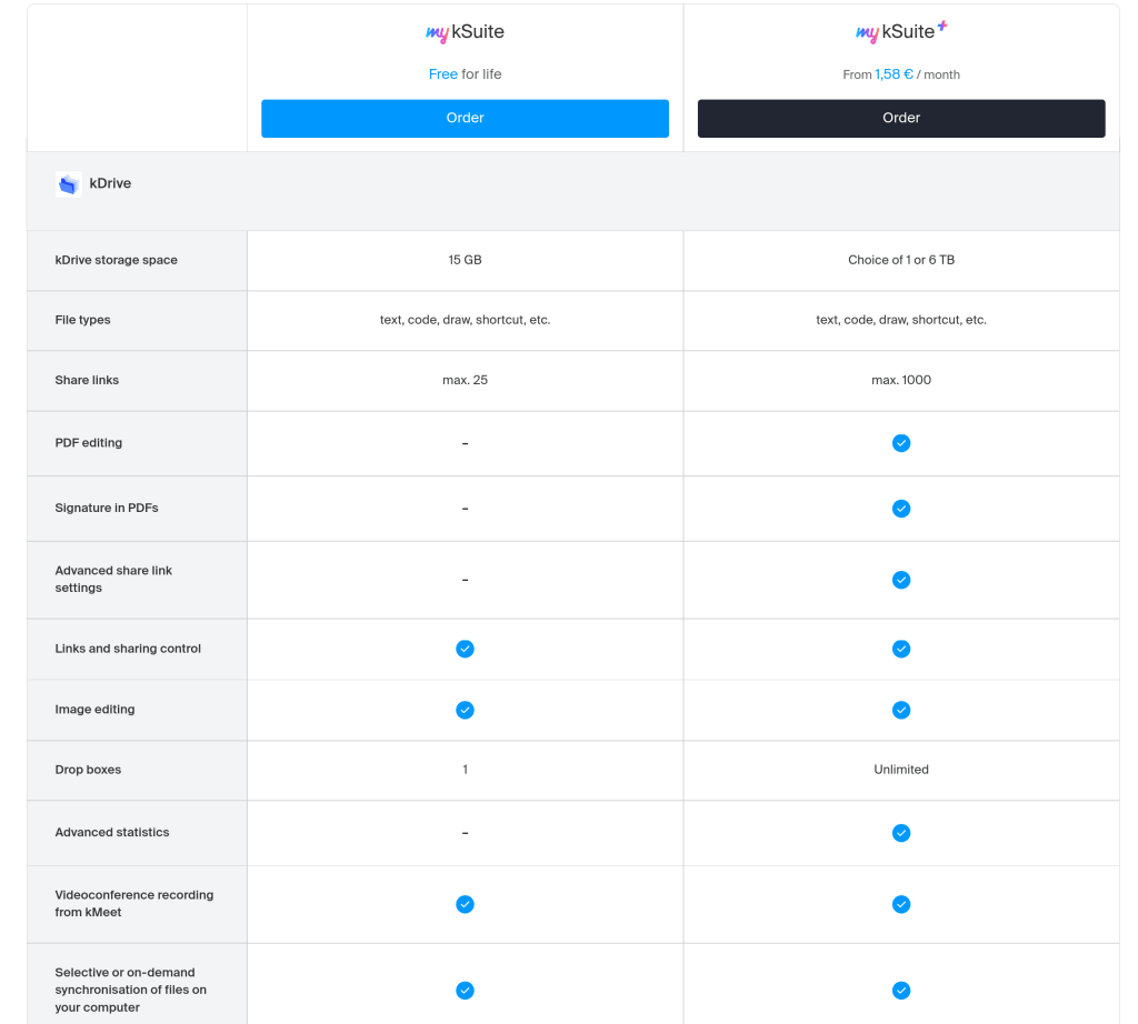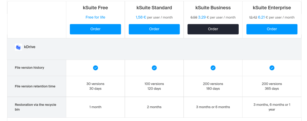 To summarize – that’s 4 versions of kSuite, 2 versions of myKsuite, and 3 versions of kDrive: 9 options to pick from!