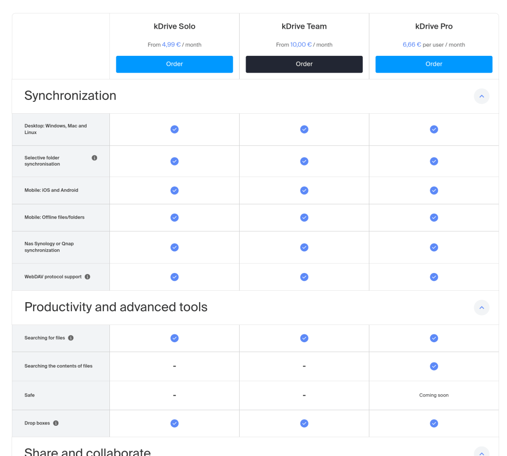 Another issue is features locked behind tiers. mykSuite+ and kDrive Solo do not include WebDav access, which would alleviate some of the issues I had with the sync client, and give me a path for placeholders on Linux via 3rd party software. but WebDav is available at higher tiers of kDrive, which require multiple individuals, or kSuite Pro, which is an entirely different branch to myKsuite+.